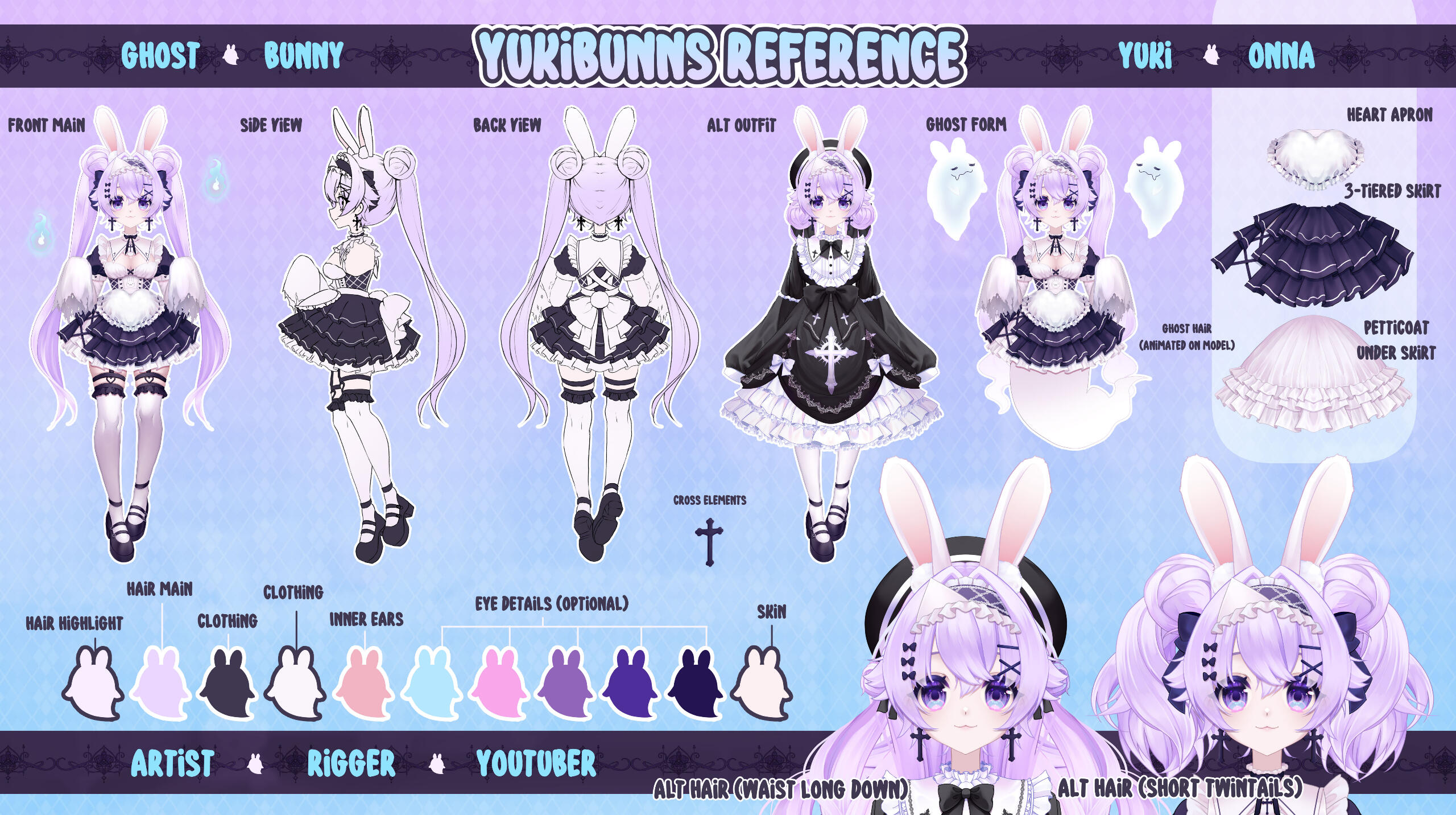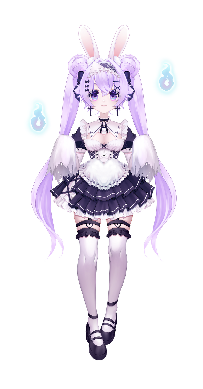 Hundreds of years ago, a maiden passes away. She foats her way up to heaven's gates, awaiting her fate. She is turned away. Assuming perhaps she had lived her life a little too sinfully, she takes her rejection as meaning she belongs in the other place. At the entrance, she is again denied.Neither heaven nor hell would accept her, making her an earthbound spirit.To escape this purgatory, she decided she would serve living beings until heaven or hell would take her. Preferably the former. To accomplish her mission easier, she searches for a vessel to possess. In her searches, she finds herself roaming a vast, snowwy valley. Hiding under a small rock alcove and some dead shrubbery, she finds a rabbit, clinging on to its last thread of life. Clearly sick and suffering, she decides to help it by possessing it instead of a human.This created her half human/half rabbit form, with the two floating wisps nearby, being both her and the rabbit's souls.She opened a maid café to serve and entertain people, hoping to get closer to heaven, though it more likely than not gets her into trouble.In the winter, she changes form into a Yuki Onna- The spirit of winter, guiding lost souls through the bitter cold.She does not know how she died. Her memories of her past life are spotty.Due to the combination of the ill rabbit and possibly whatever ailments she had in her living days, she suffers through periods of weakness, where maintaining her physical form is particularly hard. She rests for about a week or so to manifest again.